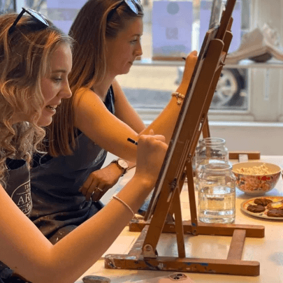 When you arrive, you’ll be welcomed into our bright Canonmills studio and offered an apron, a seat at your easel and a drink to settle in. Our professional artist tutors guide the session step by step, creating an atmosphere that feels friendly, informal and inclusive. No experience is needed, and everyone is supported throughout.